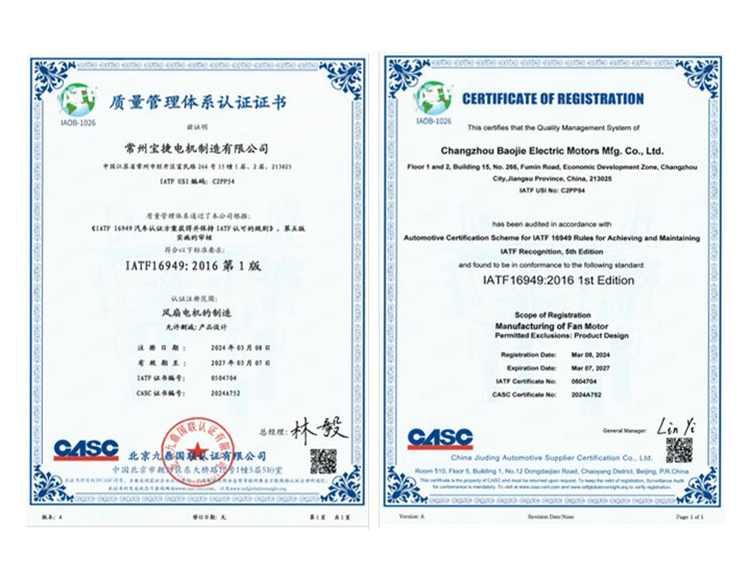 常州寶捷電機制造有限公司,成立于2001年。專業從事各類單相交流電機、高效節能電機及機電一體化產品的設計開發、生產制造、銷售服務的中美合資企業。產品主要應用于各類家用及商用空調器、各類電器及特種移動車輛行業。產品符合UL、CE、CSA、SASO、CCC、ROHS等國際標準,全部出口歐美等國際市場。公司獲得IATF16949:2016質量體系認證,擁有UL認證實驗室,應用SAP精益管理系統,為國內外客戶提供優質的產品和服務!